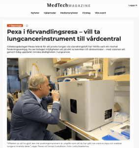 MedTech Magazine, Sveriges enda media som är helt inriktade på att skriva om medicinsk teknik, har i dagarna publicerat ett längre reportage om PExA. Under rubriken ”PExA i förvandlingsresa – vill ta lungcancerinstrument till vårdcentralen” ges stor uppmärksamhet åt den utandningsbaserade teknik som bolaget utvecklat, med potential att på sikt användas inom framtida diagnostik av lungsjukdomar.